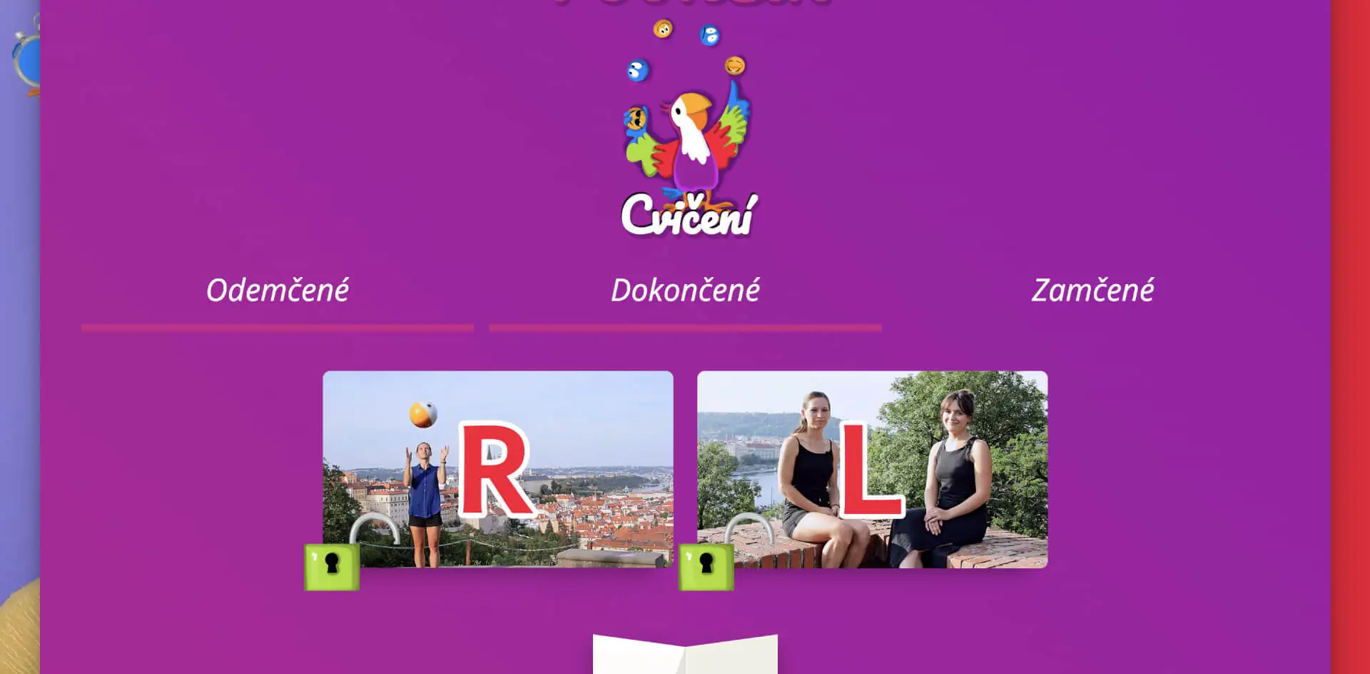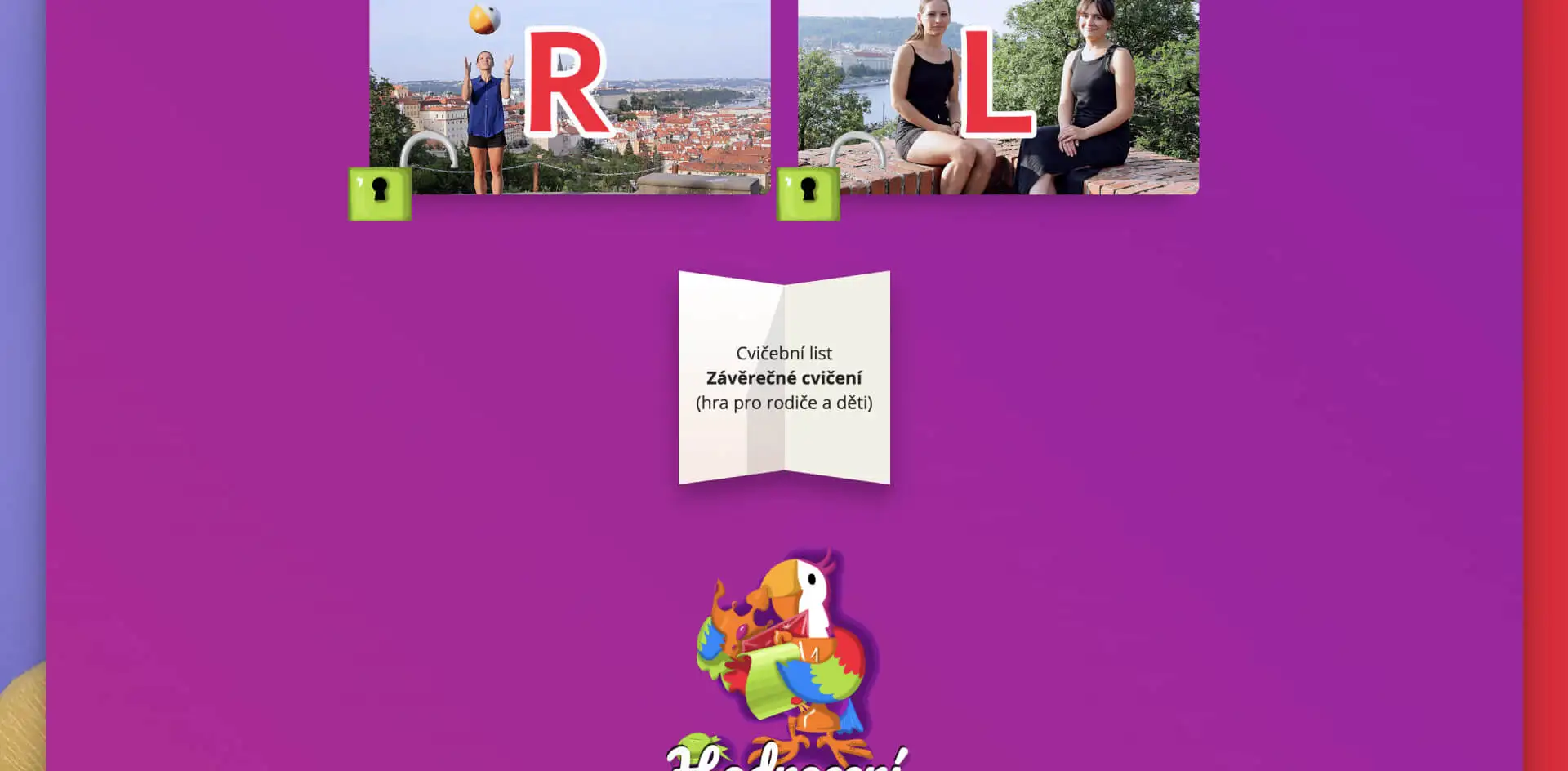 Kliknutím na ikonu odemčených a dokončených souboru lekcí pro cvičení hlásek se vám zobrazí výukové video a cvičební list.