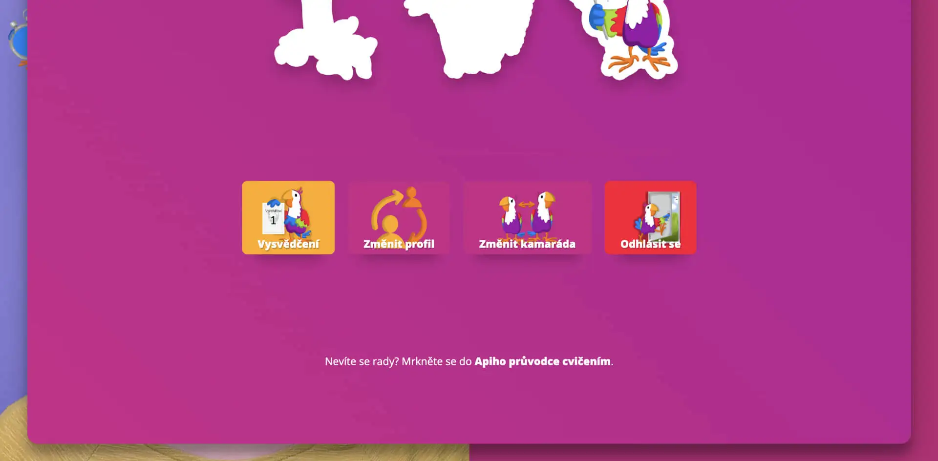 Úplně nejníže jsou tlačítka Vysvědčení, Změna profilu, Změna kamaráda, a Odhlásit se.