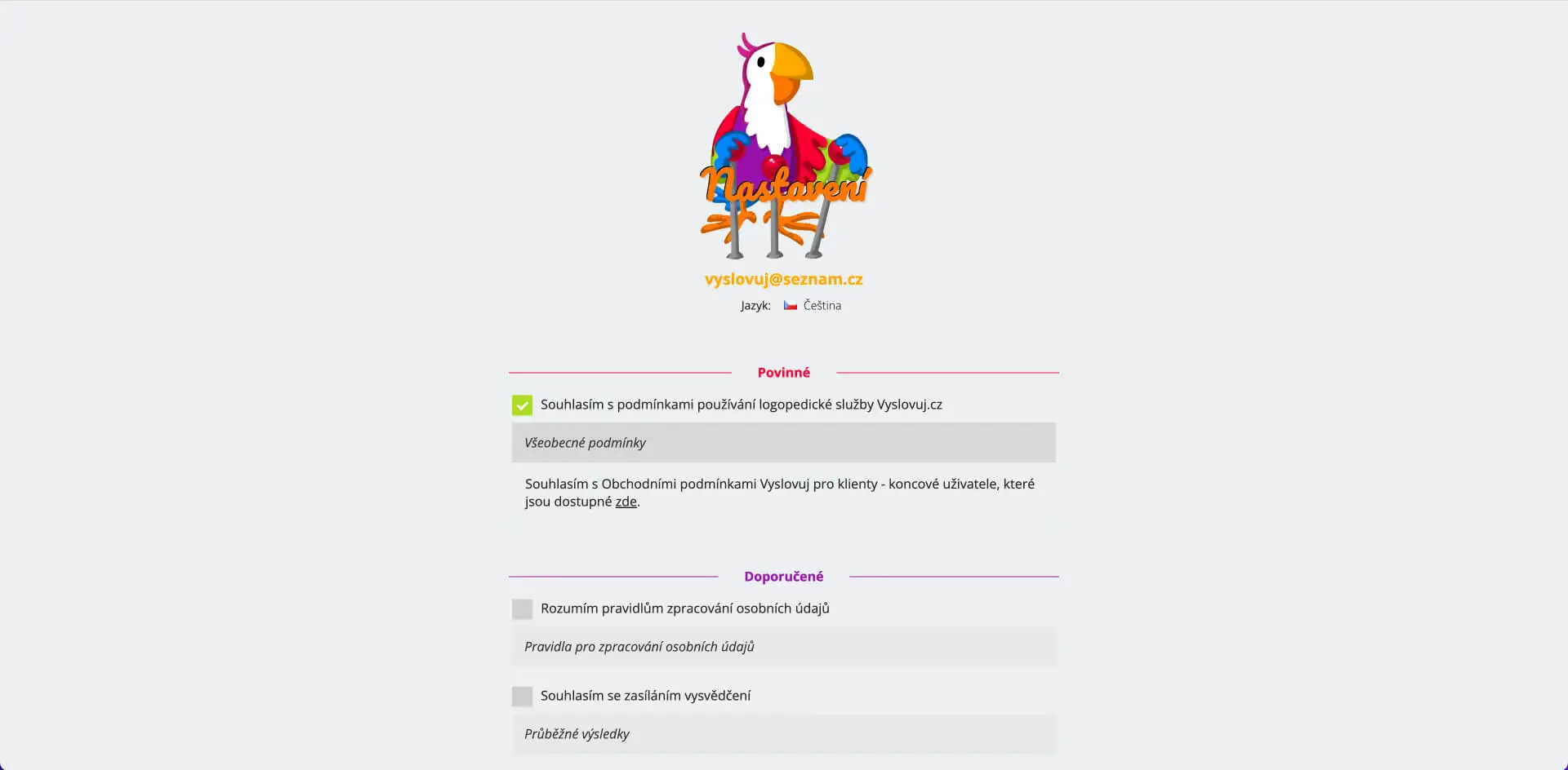 Jediné nastavení, které je povinné, je "Souhlasím s podmínkami používání logopedické služby Vyslovuj®".