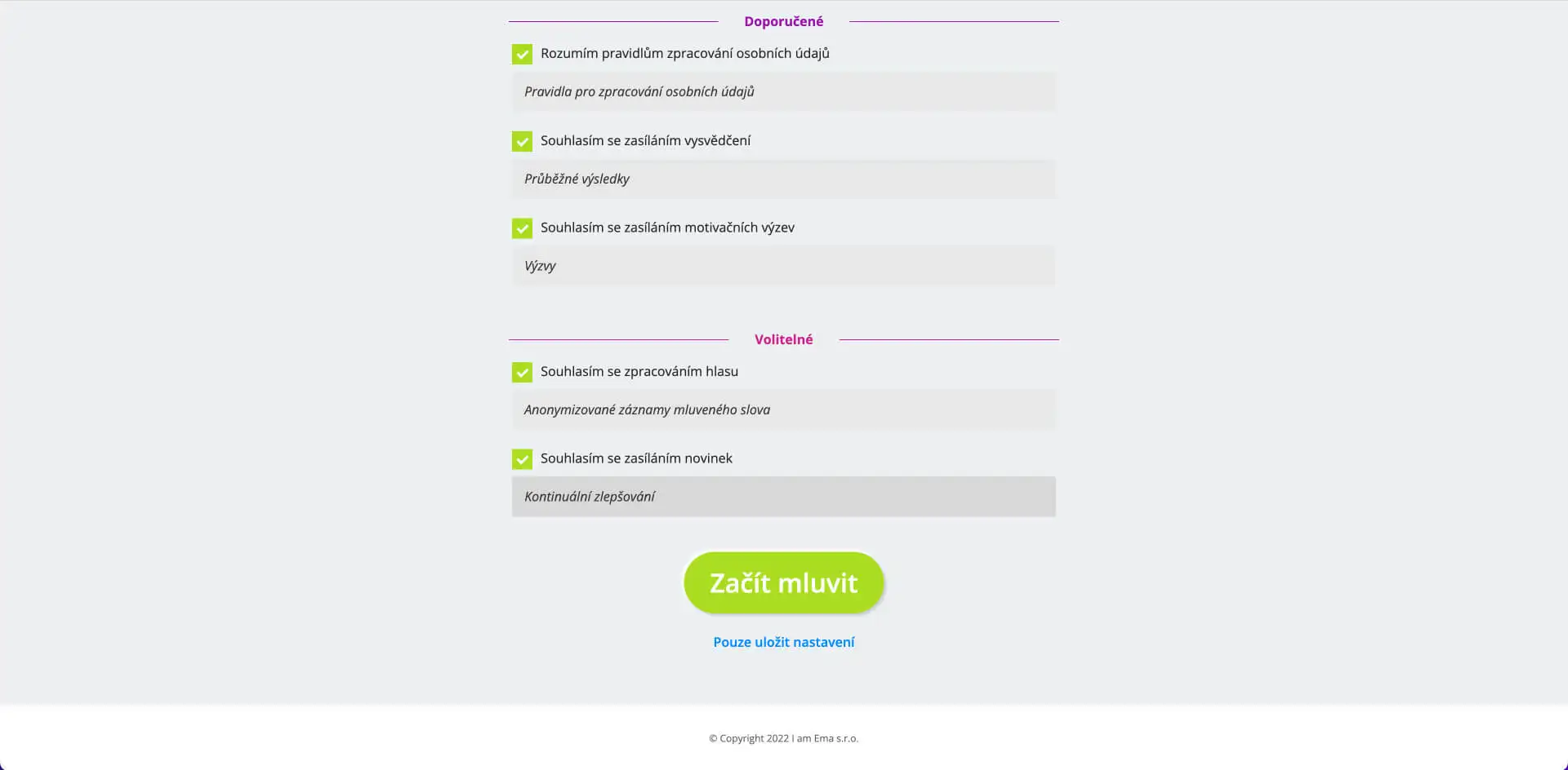 Nastavení potvrdíte kliknutím na tlačítko "Začít mluvit" nebo "Pouze uložit nastavení".